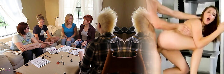 The game night gets steamy as the lezzy redhead lures the blonde and they start kissing and fingering