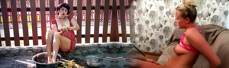Retro Maid Prepares Potatoes For Dinner. Antique Performance. Vintage Maid Sans Panties. Masturbation Outdoors. Full