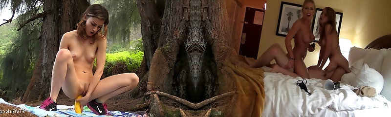 Girls on vacation play in the woods and fuck their veggies